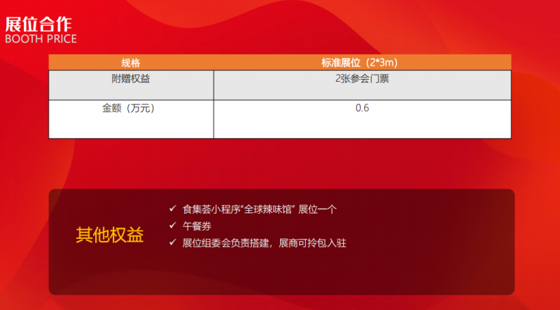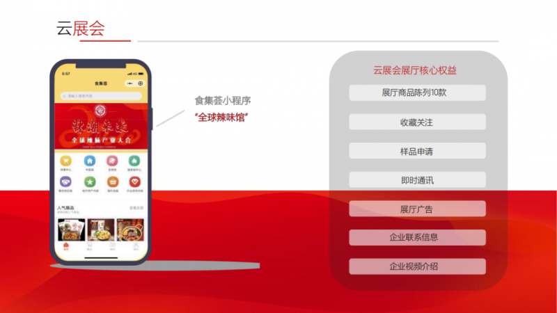 辣已然风靡全球,大会同期推出“食集荟”小程序“全球辣味馆”, 汇集全球中餐协会及品牌,打破空间屏障,实现线上线下展会融合,助力企业面向世界的发展之路。
