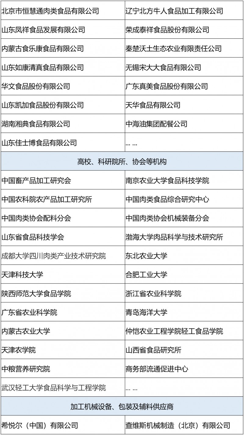 包含但不限于:肉制品加工、速冻调理、餐饮连锁等相关企业的研发技术人员、生产管理人员、质量控制人员;禽畜养殖及屠宰企业的技术人员;辅料供应商、机械设备厂家、食品安全管理、检测公司的相关技术人员;行业协会、高校、科研院所等单位从事应用研究的专家学者和研究生等。