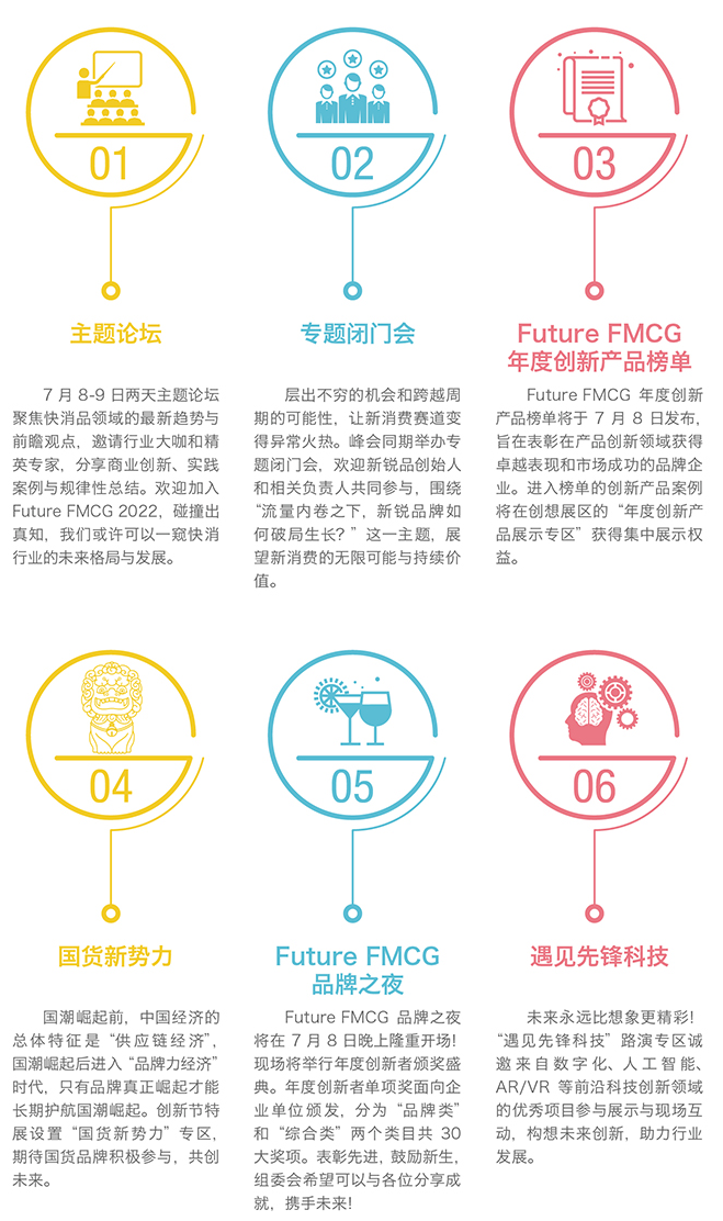 三天峰会涵盖7大主题论坛、3场专题闭门会、圆桌对话、Future FMCG品牌之夜、年度创新者颁奖盛典、白皮书与年度创新产品TOP榜单发布&展示专区、国货新势力展、先锋科技路演等多项活动,以期为品牌企业创造多样化且有价值的学习平台与社交场合。