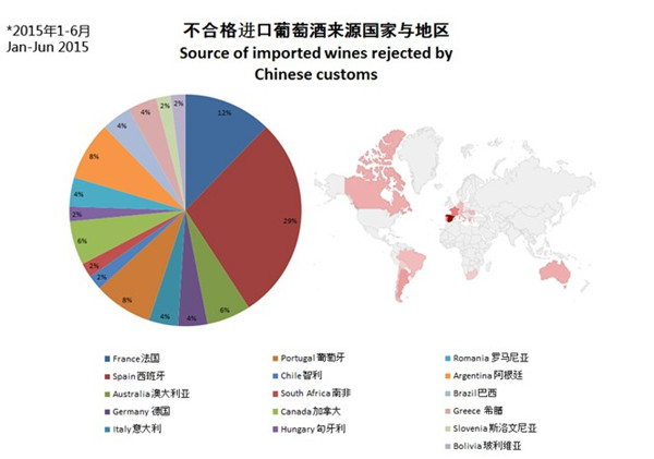 国家质检总局发布的报告显示,2015年前六个月中国海关共拒绝了49批进口葡萄酒入境,而这些外国葡萄酒被中国海关禁止入境的主要原因则是因为食品防腐剂过量及铜过量。其中20%由于山梨酸超标,18%由于铜超标。