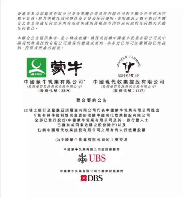1月5日,蒙牛乳业与现代牧业在港联合发布公告称,蒙牛乳业拟以每股1.94港元的价格,收购16.7%的现代牧业股份,交易总金额约18.73亿港元,较现代牧业昨日收市价溢价7.18%。交易完成后,蒙牛持股将增加至39.9%(全面摊薄后为37.7%),仍将为现代牧业最大单一股东。
