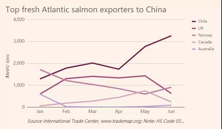 在自贸协议的辅助下,智利三文鱼对华出口有着显著增长。AgroSuper(爱阁)公司中国区经理Alejandro Cuevas Streeter称,上半年智利出口三文鱼2.4万吨(包括冰鲜、冷冻大西洋鲑和银鲑)。国际贸易中心(ITC)数据显示,上半年智利对华出口冰鲜三文鱼12,870吨,同比增长153%。