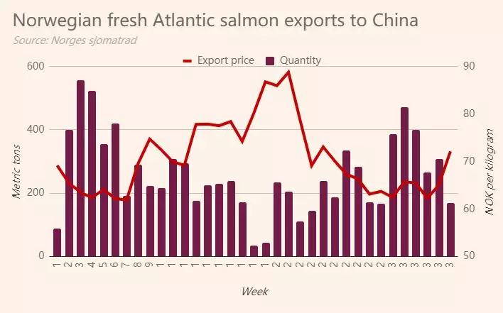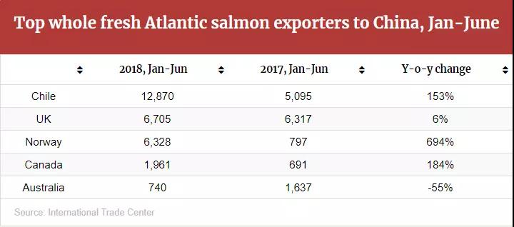 挪威三文鱼上半年的对华出口量为6,328吨(挪威海产局数据为7,045吨),同比增长694%(不含越南边贸)。英国对华出口冰鲜三文鱼6,705吨,增长6%;加拿大出口1,961吨,增长184%。