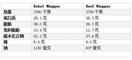 根据Hungry Jack官网上的营养信息,以下是Rebel Whopper与普通牛肉版本的比较。