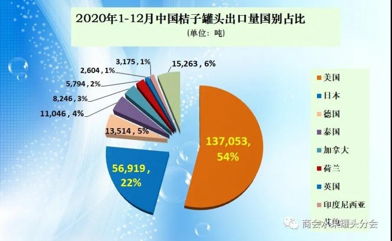对日本出口5.70万吨,占中国桔子罐头出口总量22%,数量同比基本持平,金额和单价均下降2%;