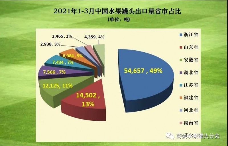 2021年1-3月,中国橘子罐头出口6.66万吨,占水果罐头出口总量的59%;中国桃罐头出口2.90万吨,占水果罐头出口总量的26%;中国梨罐头出口1.22万吨,占水果罐头出口总量的11%。