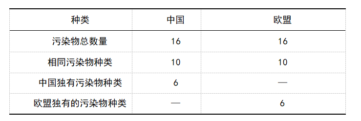 中国和欧盟均有规定的污染物指标共计10项,重合率62.5%,包括铅、镉、汞、无机砷、无机锡、硝酸盐、3-氯-1,2-丙二醇、多氯联苯和苯并(a)芘和三聚氰胺;中国独有的污染物指标共计6项,为总汞、总砷、铬、镍、N-二甲基亚硝胺和亚硝酸盐;欧盟独有的污染物指标共计6项,为缩水甘油脂肪酸酯、3-氯丙二醇与3-氯丙二醇脂肪酸酯之和(以3-MCPD计)、二英之和、二英和类二英多氯联苯之和、苯并(a)芘与苯并(a)蒽、苯并(B)荧蒽和总和以及高氯酸盐。中国与欧盟污染物种类差异见表1。