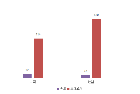 图1 中国与欧盟食品中污染物限量涉及的食品分类及具体食品数量比较