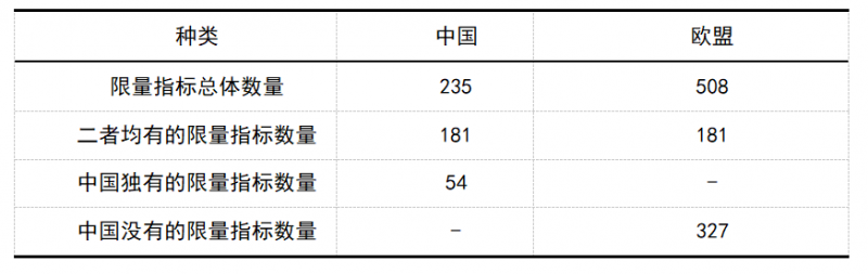 表2 中国与欧盟食品中污染物要求的限量指标数量比较
