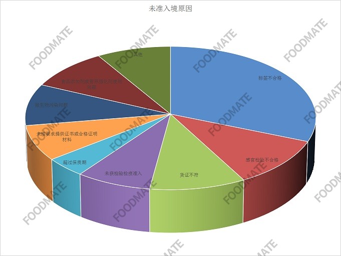 这些未准入境食品不合格原因主要为标签不合格、感官检验不合格、货证不符、未获检验检疫准入、超过保质期、未按要求提供证书或合格证明材料、微生物污染问题、食品添加剂或营养强化剂使用问题,还有部分食品检出挥发性盐基氮超标、溴酸盐超标含量不符合国家标准要求、包装不合格、过氧化值超标、含有未获检验检疫准入的植物源性成分、污秽腐败、镉超标、检出非食用添加物食用蛋壳粉、检出呋喃唑酮代谢物、甲基汞超标等其他问题。其中,标签不合格居首位。
