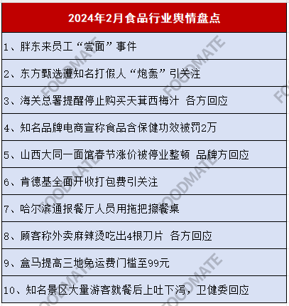 食品伙伴网讯 2024年2月食品行业舆情信息如下: