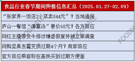 食品伙伴网讯 2025年01月27日-02月09日食品行业舆情信息有: