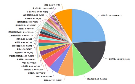 未准入境食品涉及的不合格原因如下:一是标签标识不规范,共计267批次,占总不合格的24.29%;二是产品资料不全,共计169批次,占总不合格的15.38%;三是货证不符,共计105批次,占总不合格的9.55%;四是产品未获准入,共计87批次,占总不合格的7.92%;其余不合格原因占比均低于7%。详细不合格原因分类占比见图2。(注:同一批次产品可能存在多个项目不合格,因此不合格项目批次统计大于总不合格产品批次)
