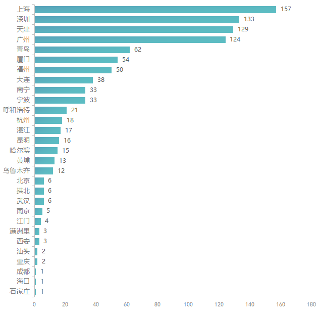 上述不合格产品进境口岸主要集中在上海、深圳、天津、广州等城市,以上城市不合格产品数量均超过100批次,各进境口岸查获不合格产品数量详见图4。