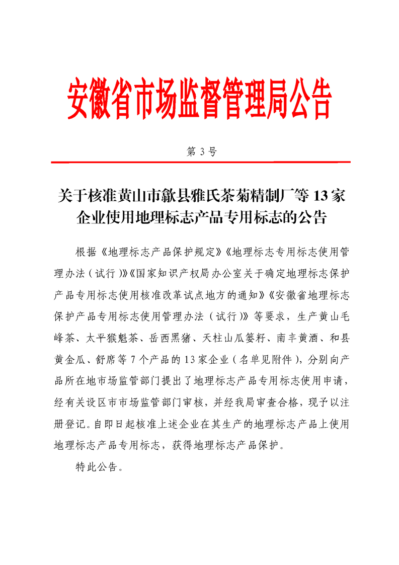 安徽省市场监督管理局关于核准黄山市歙县雅氏茶菊精制厂等13家企业使用地理标志产品专用标志的公告