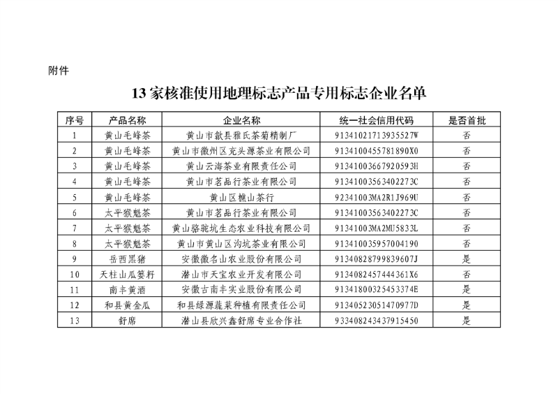根据相关要求,生产黄山毛峰茶、太平猴魁茶、岳西黑猪、天柱山瓜篓籽、南丰黄酒、和县黄金瓜、舒席等7个产品的13家企业, 分别向产品所在地市场监管部门提出了地理标志产品专用标志使用申请,经有关设区市市场监管部门审核,并经我局审查合格,现予以注册登记。自即日起核准上述企业在其生产的地理标志产品上使用地理标志产品专用标志,获得地理标志产品保护。