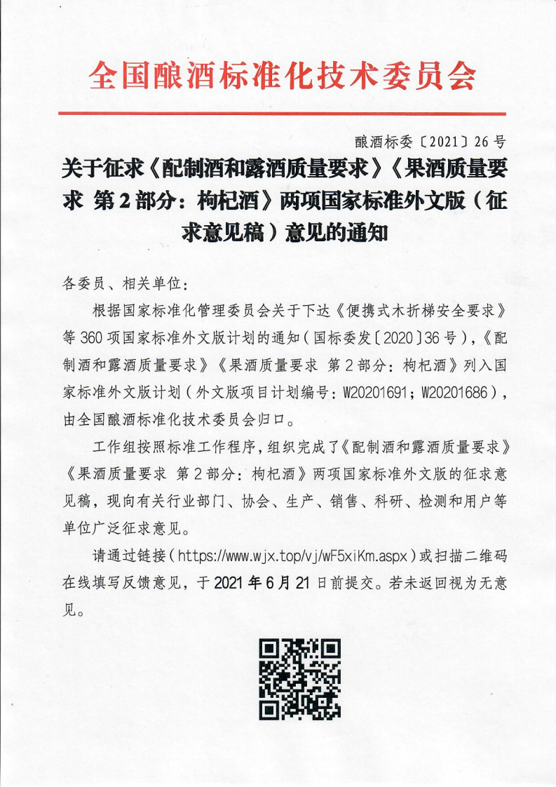 关于征求《配制酒和露酒质量要求》《果酒质量要求 第2部分:枸杞酒》两项国家标准外文版(征求意见稿)意见的通知