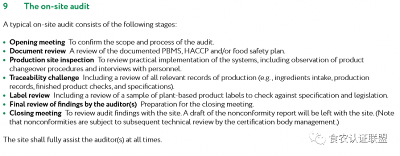 审核的范围应事先与认证机构达成一致,并应包括标准内的所有适用要求,以及对生产现场的认证安排中所列产品进行的所有植物基生产过程。