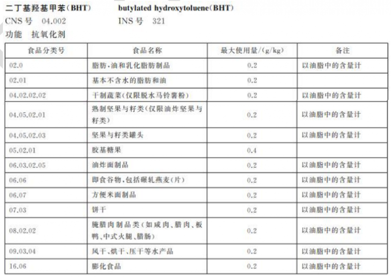 BHT可用于12种类别的产品中,取消了“02.01基本不含水的脂肪和油”类别,除胶基糖果最大限量为0.4g/kg外,其他允许使用的食品类别最大限量为0.2g/kg;