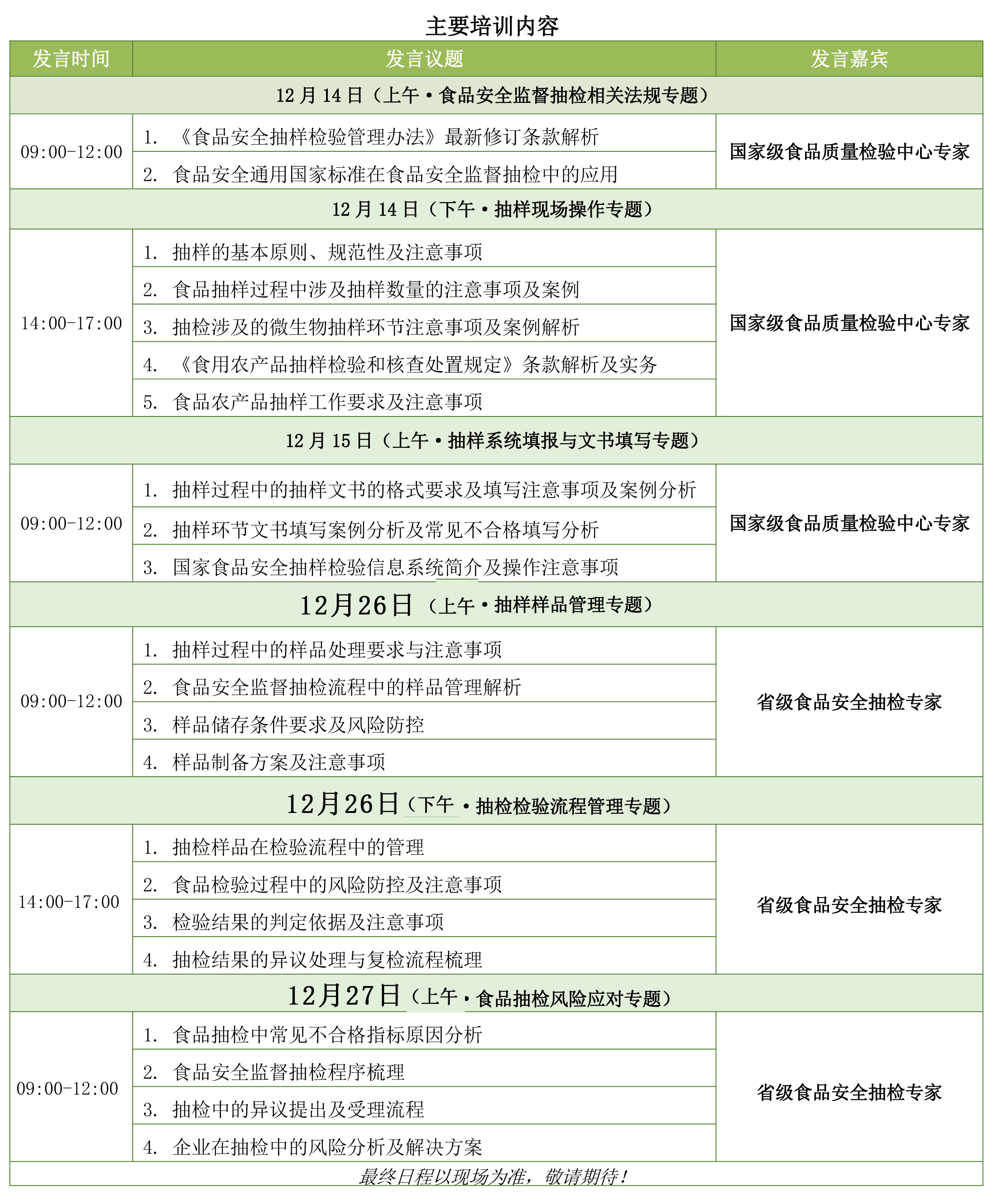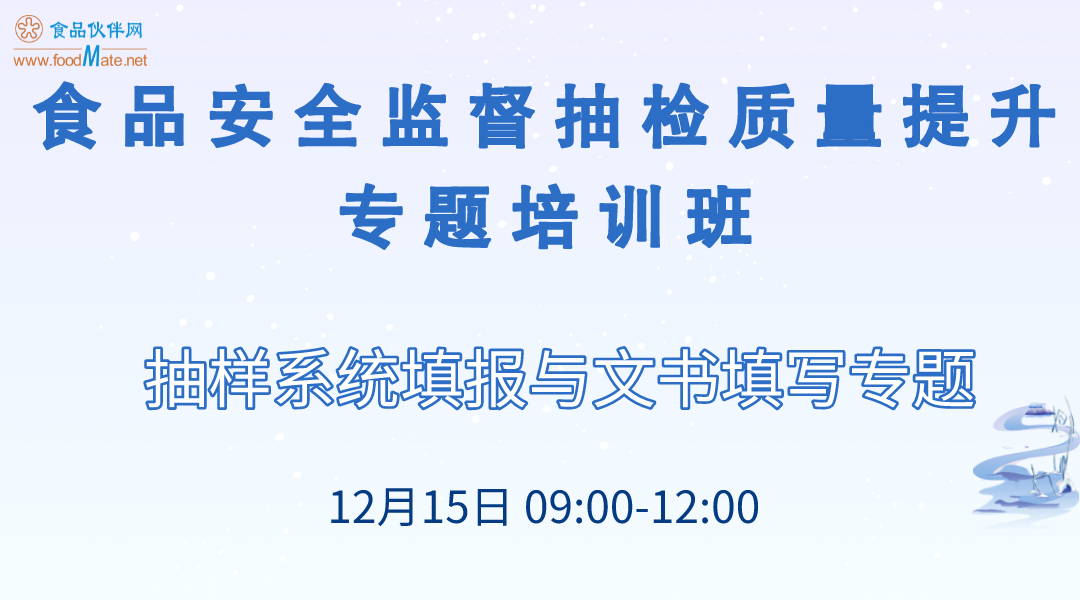 为了进一步落实企业主体责任,帮助承检机构规范抽检工作,规避食品抽样过程中的风险,食品伙伴网计划举办“食品安全监督抽检质量提升专题培训班”。现将相关事宜通知如下: