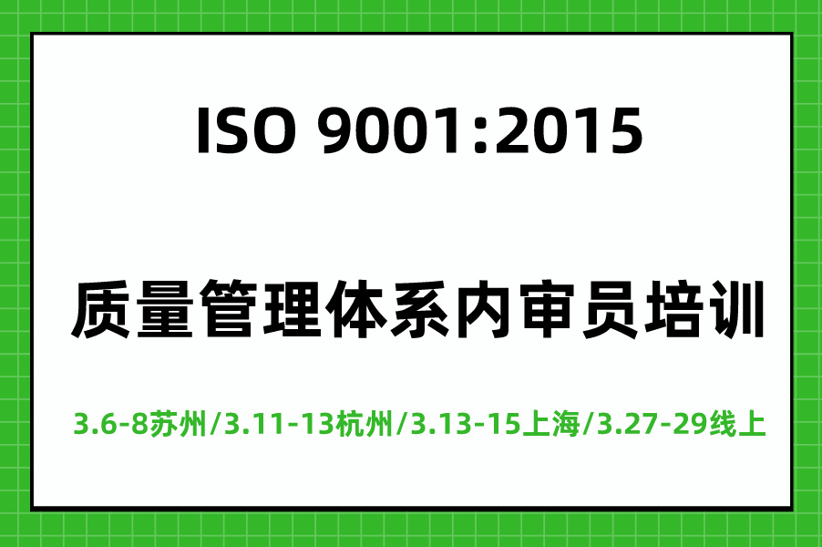 ISO 9001:2015质量管理体系内审员培训 | 上海 | 1.15~17 | 2.21~23 | 3.13~15 | 4.15~17 | 5.15~17 | 6.10~12 | 7.17~19 | 8.12~14 | 9.11~13 | 10.14~16 | 11.13~15 | 12.11~13 |